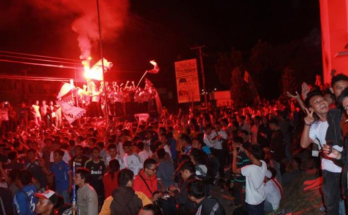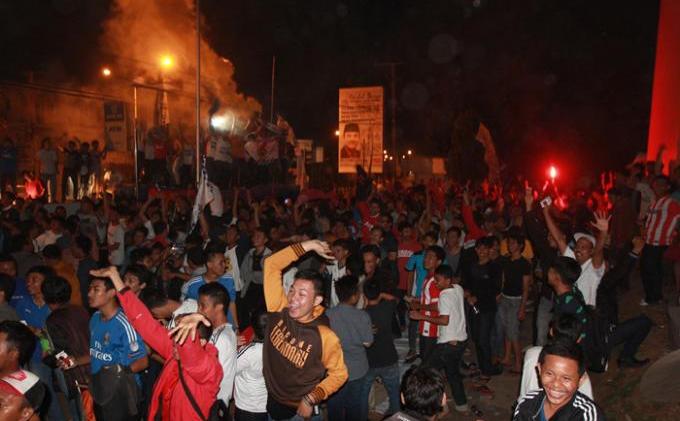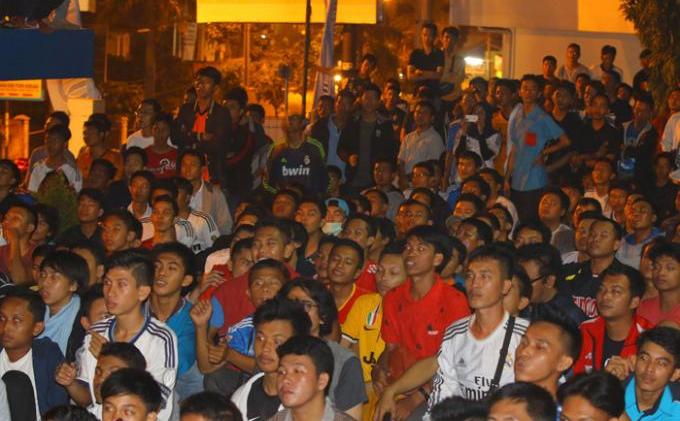 TRIBUNLAMPUNG.CO.ID, BANDAR LAMPUNG-SCTV bersama Harian Tribun Lampung menggelar nonton bareng final Liga Champions antara Real Madrid vs Atletico Madrid di halaman parkir kantor Tribun Lampung, Sabtu (24/5/2014).