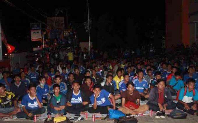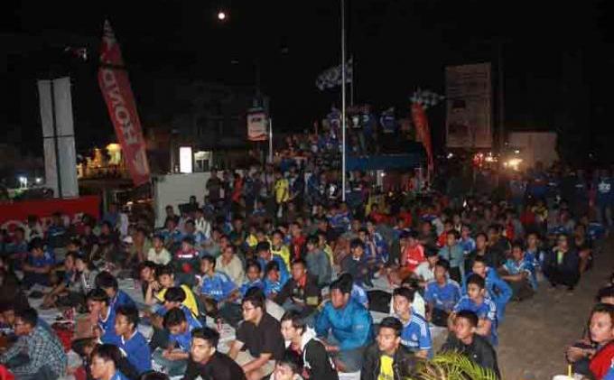 TRIBUNLAMPUNG.CO.ID, BANDAR LAMPUNG-Suporter Chelsea, yang tergabung dalam Chelsea Indonesia Supporter Club (CISC) Lampung, memeriahkan nonton bareng (nobar) laga Liverpool vs Chelsea, Sabtu (8/11) malam, di halaman parkir Tribun Lampung.