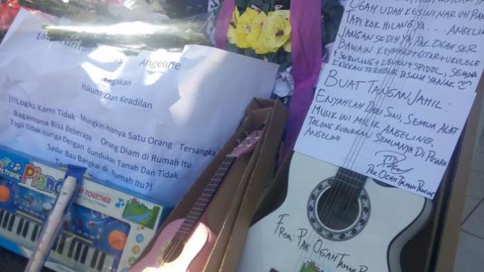 TRIBUNLAMPUNG.CO.ID, BALI - Ada sesuatu yang menarik saat mengunjungi ruang jenazah RSUP Sanglah Bali. Di antara tumpukan bunga dan boneka, terdapat mainan anak-anak berbentuk gitar, seruling dan piano untuk Angeline.
