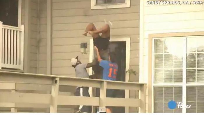 TRIBUNLAMPUNG.CO.ID, GEORGIA - Sungguh luar biasa perbuatan dua pemuda ini menyelamatkan dua wanita yang melompat dari gedung terbakar.