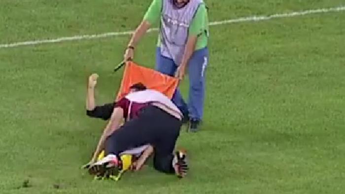 Tubuh pemain malang itu lalu dibanting sesampainya di luar lapangan