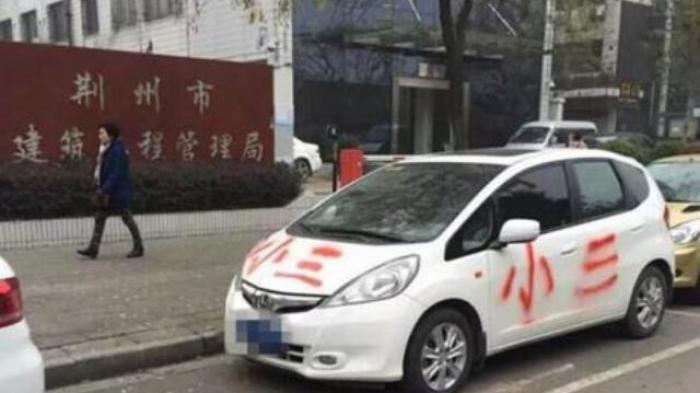Di mana, sang istri menyemprotkan cat yang bertuliskan kata "Xiao San" (yang berarti "Nyonya") di keempat sisi mobil suaminya, laporan Shanghaiist.