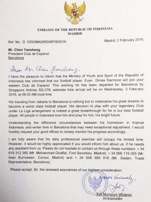 Dalam surat bertanggal 2 Februari 2016 tersebut, Yuli menjelaskan bahwa Evan akan bergabung dengan Espanyol. Yuli menjelaskan bahwa Evan akan tiba pada Rabu (3/2/2016) pukul 8.30 waktu setempat, atau 14.30 WIB.