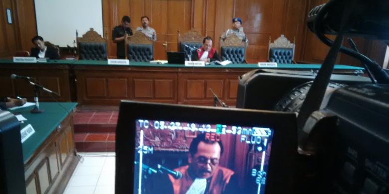 Tepat di belakang hakim tunggal Ferdinandus, yang sedang membacakan putusan, terdapat tiga personel polisi, satu di antaranya dari unsur Propam, serta satu orang dari pihak keamanan pengadilan.
