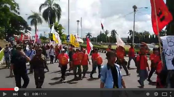 TRIBUNLAMPUNG.CO.ID, BANDAR LAMPUNG - Aksi massa memperingati Hari Buruh Internasional yang jatuh pada 1 Mei 2016, tiba di Kantor Gubernur Lampung, setelah sebelumnya massa berorasi di Tugu Adipura. Massa yang tergabung dalam Pusat Perjuangan Rakyat Lampung (PPRL) tersebut dikawal oleh 408 pihak kepolisian.