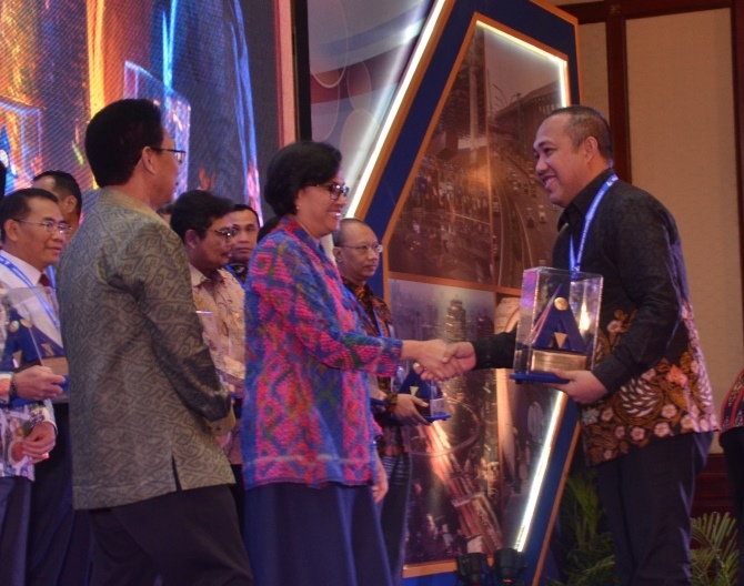 Bupati Tulangbawang Barat Umar Ahmad menerima plakat penghargaan dari Kementrian Keuangan atas keberhasilan melaksanakan pelaporan keuangan