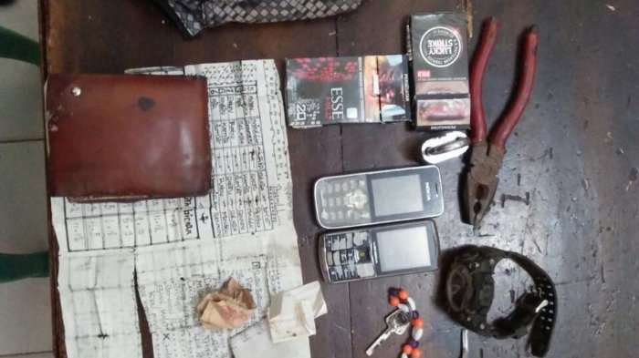 Dari tangan tersangka, polisi menyita barang bukti berupa 1 (satu) buah tas warna abu - abu yang berisikan Dompet, Tang, Kunci L, Obeng, 2 (dua) unit Handphone dan 1 (satu) bilang senjata tajam jenis Badik. tambahnya