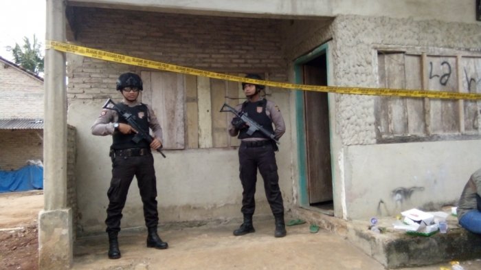 Pasca penggerebekan, tampak rumah YK masih terpasang garis polisi. Warga tidak diperkanan mendekati rumah itu. (*)