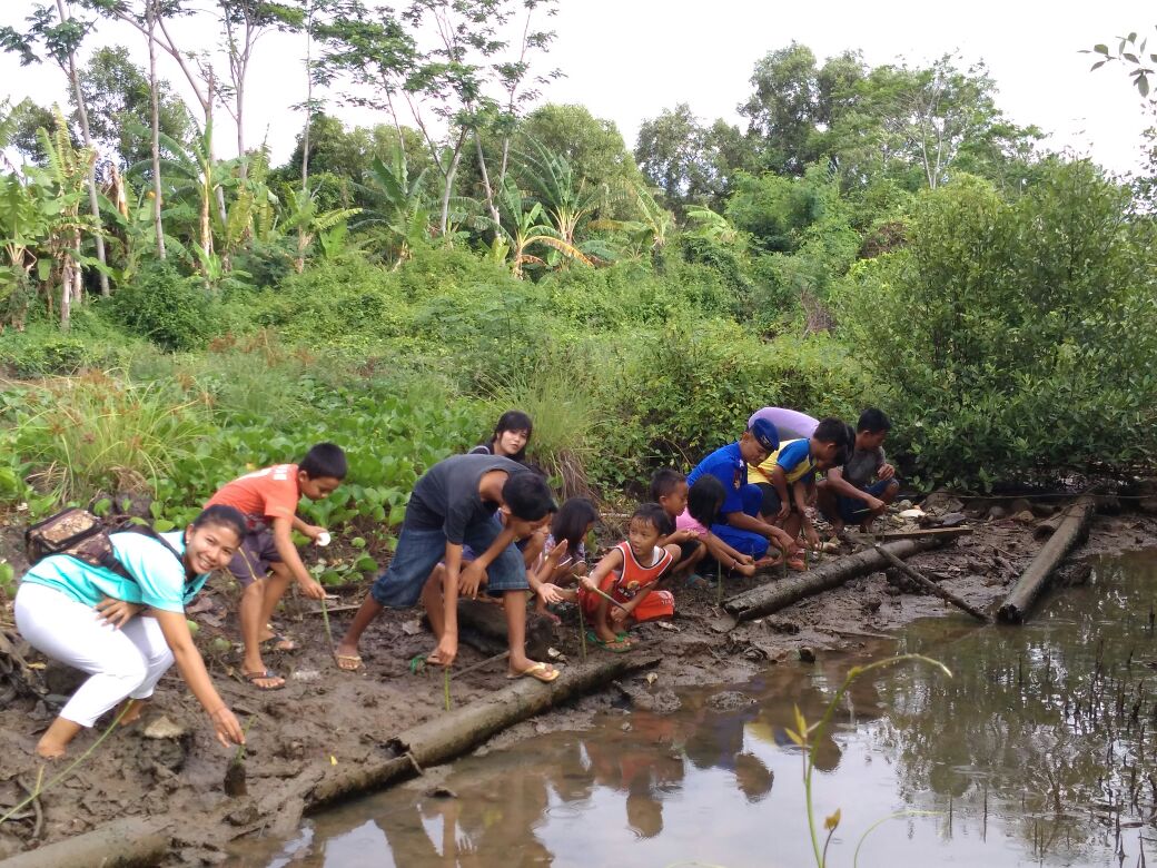 Penggiat literasi Jangkar Pustaka dan Perahu Pustaka Bakauheni menanam mangrove bersama anak-anak di Dusun Pegantungan, Desa Bakauheni