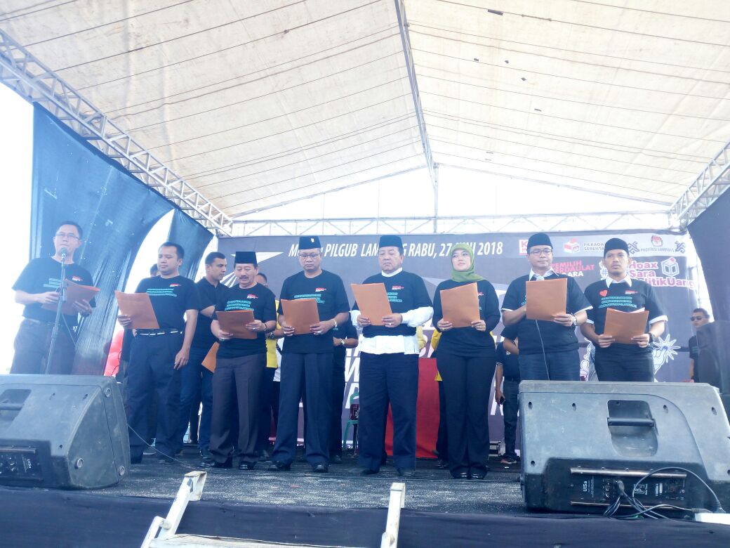TRIBUNLAMPUNG.CO.ID - Pasangan Calon Gubernur dan Wakil Gubernur Lampung hadir pada kegiatan Deklarasi Kampanye Damai yang digelar oleh KPUD Provinsi Lampung di PKOR Way Halim, Bandar Lampung, Minggu 18 Februari 2018.