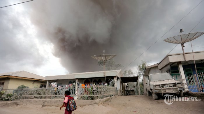 Luncuran awan panas turun menutupi pancaran sinar matahari ke beberapa desa di kaki Gunung Sinabung sehingga membuat gelap gulita seperti malam hari.