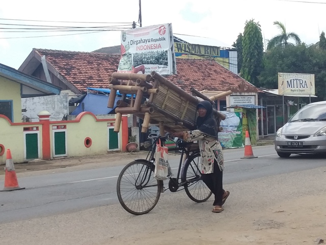 TRIBUNLAMPUNG.CO.ID, PRINGSEWU - Cuaca di Kabupaten Pringsewu Rabu (28/2) siang terlihat terik. Ketika itu seorang nenek berjalan di tepi ruas Jalan Jenderal Sudirman sembari menenteng sepeda yang mengangkut kursi dan meja risban