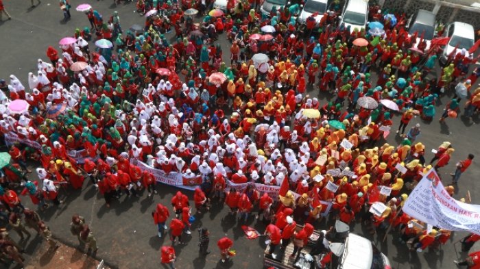 Ratusan ibu rumah tangga (IRT) yang tergabung dalam Serikat Perjuangan Rakyat Indonesia (SPRI) Lampung menggelar aksi damai di depan Gedung Pelayanan Terpadu Kota Bandar Lampung, Kamis, 8 Maret 2018.
