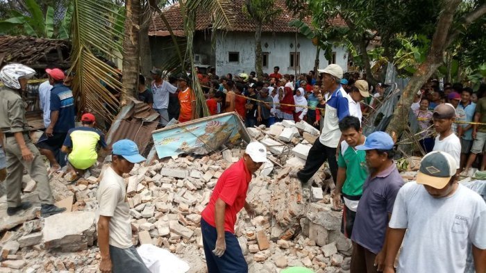 TRIBUNLAMPUNG.CO.ID, CIREBON - Gedung Kesenian Cirebon di kawasan Gegesik, Cirebon, Jawa Barat ambruk, Senin (16/4/2018).