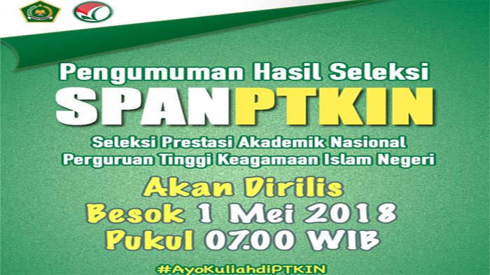 TRIBUNLAMPUNG.CO.ID - Hasil Seleksi Prestasi Akademik Nasional Perguruan Tinggi Keagamaan Islam Negeri (SPAN PTKIN) diumumkan, Selasa (1/5/2018) pagi, mulai pukul 07.00 WIB.