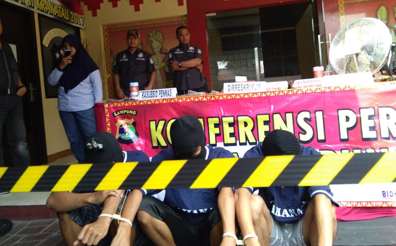 Ketiganya diketahui bernama Kapibsyah (30), warga Perumnas Way Kandis, Tanjung Senang; Fredi Irawan alias Ewok (31), warga Kelurahan Matagara, Kecamatan Tiga Raksa, Tangerang; dan Rio Gunawan (29), warga Perumnas Way Kandis, Tanjung Senang.