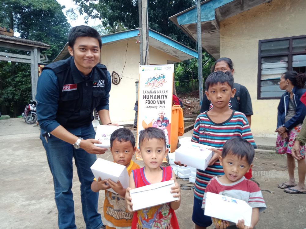 Setelah melewati pemukiman penduduk, relawan ACT Lampung segera menurunkan dua ratus kotak berisi nasi, ayam, sayur, sambal, buah dan air mineral.