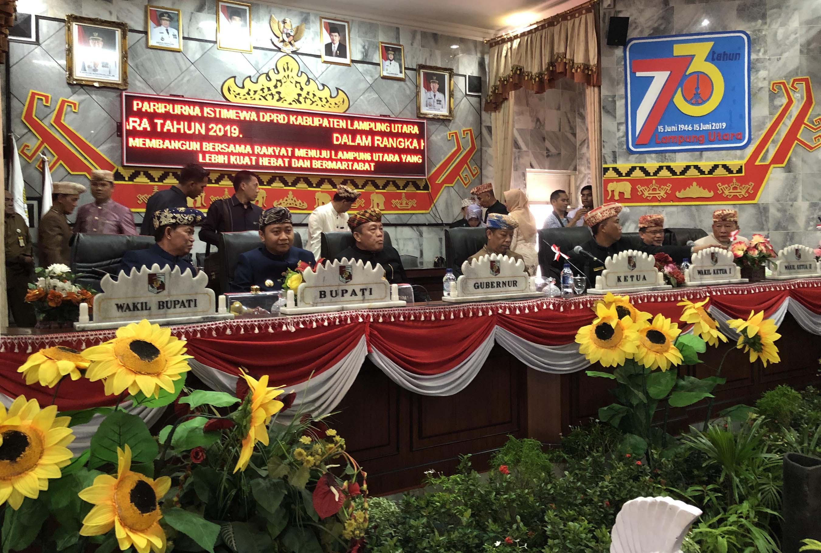 Dalam rangka memperingati HUT Lampung Utara ke -73, DPRD Lampung Utara menggelar rapat paripurna istimewa, Senin 17 Juni 2019.