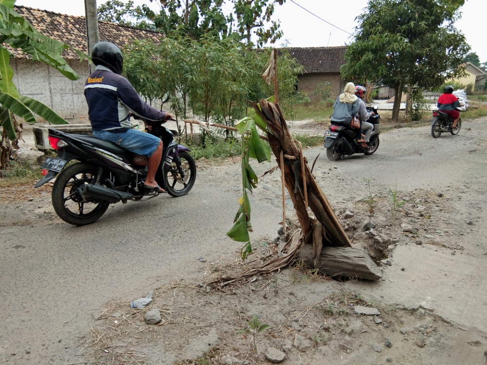 Kini pada gorong-gorong yang ambrol tersebut oleh warga diberi pohon pisang sebagai penanda bagi pengguna jalan agar tidak terperosok.