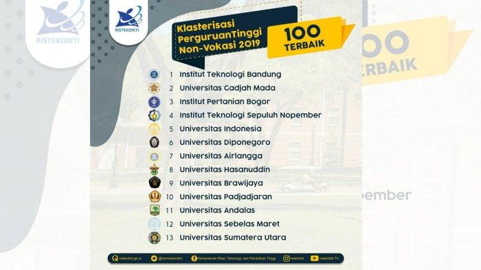 TRIBUNLAMPUNG.CO.ID - Kementerian Riset Teknologi dan Pendidikan Tinggi Negeri (Kemenristekdikti) menyampaikan hasil klasterisasi perguruan tinggi non-vokasi (universitas, institut, dan sekolah tinggi) dan perguruan tinggi vokasi di Indonesia tahun 2019.
