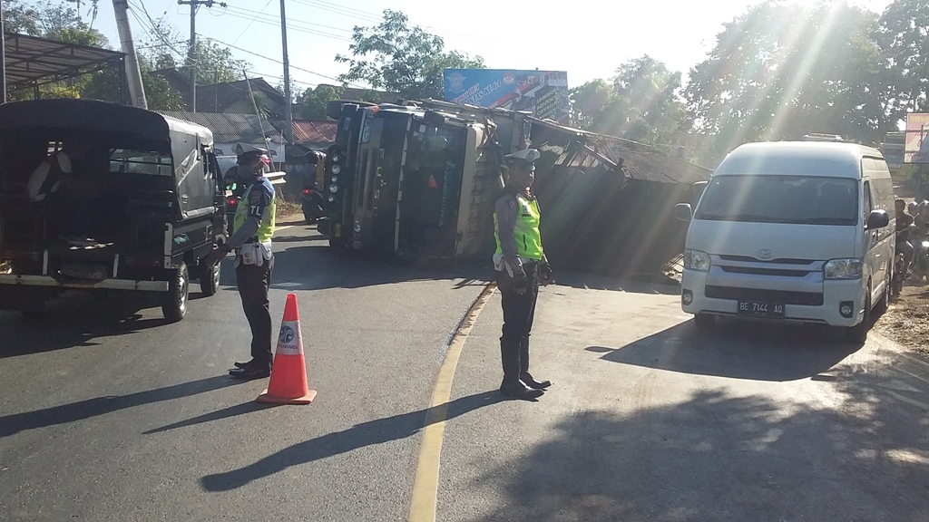 Namun belum sampai tujuan, truk tersebut terbalik di ruas Jalinbar menikung dan miring di Kelurahan Fajaresuk, Kecamatan Pringsewu, Kamis (7/11/2019) pagi.
