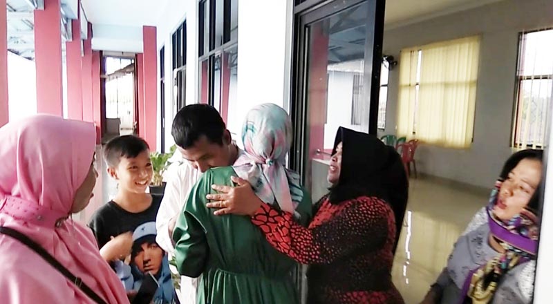 Ari Paira Jaya yang mendekam akibat kasus narkoba datang ke aula Lapas Kotabumi dengan mengenakan pakaian koko putih berpeci.