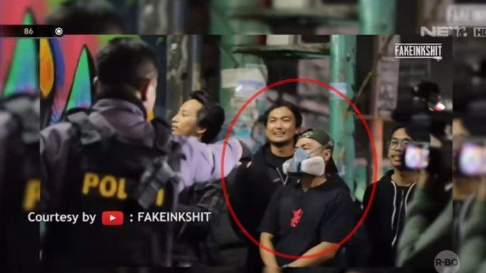 TRIBUNSOLO.COM -- Artis pelawak Wendy Cagur ditunjuk-tunjuk polisi saat razia sekelompok orang yang mencoret-coret toko seorang warga di Depok.