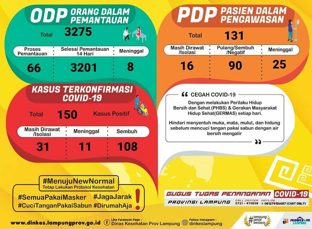 Berdasarkan data yang dilansir akun Instagram resmi Diskes Lampung, Rabu (10/6/2020), total kasus positif sampai saat ini mencapai 150 kasus.