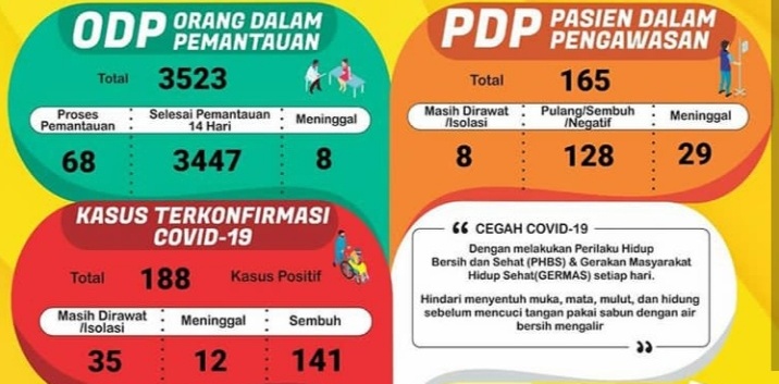 Sebelumnya, pada Jumat (26/6/2020) pasien positif corona sebanyak 187 kasus, PDP corona 162 kasus, dan ODP 3.433 kasus.