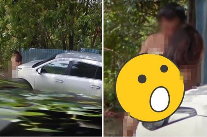 Keduanya nampak tak mengenakan sehelai pakaian pun. Pasangan ini pun melakukan tindak tak senonoh ini di depan mobilnya yang berwarna putih.