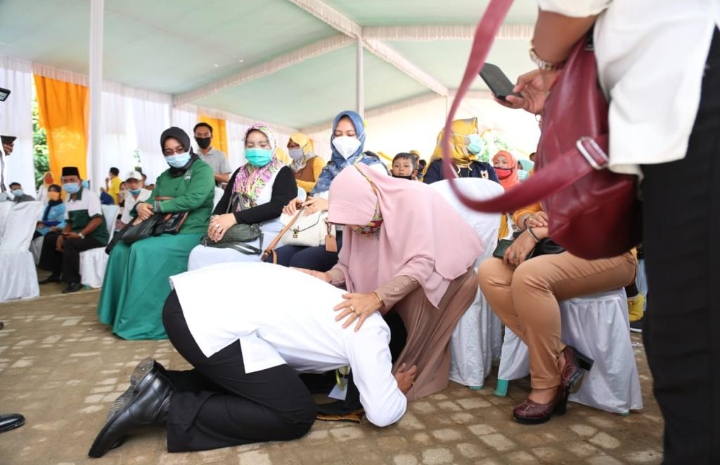 Musa Ahmad bersimpuh di kaki sang bunda seusai mengikuti proses pendaftaran di kantor KPU Lampung Tengah, Sabtu (5/9/2020).