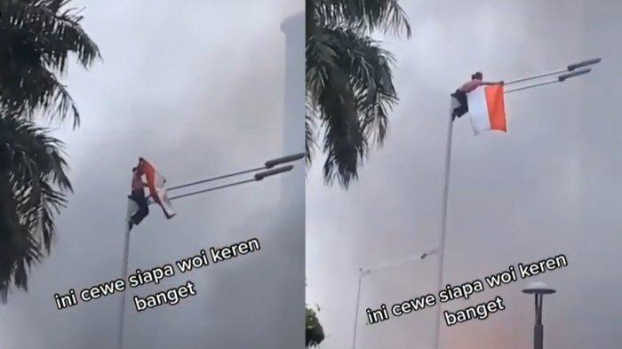 Aksi Seorang Wanita Nekat Panjat Tiang Lampu Jalan Kibarkan Bendera Merah Putih