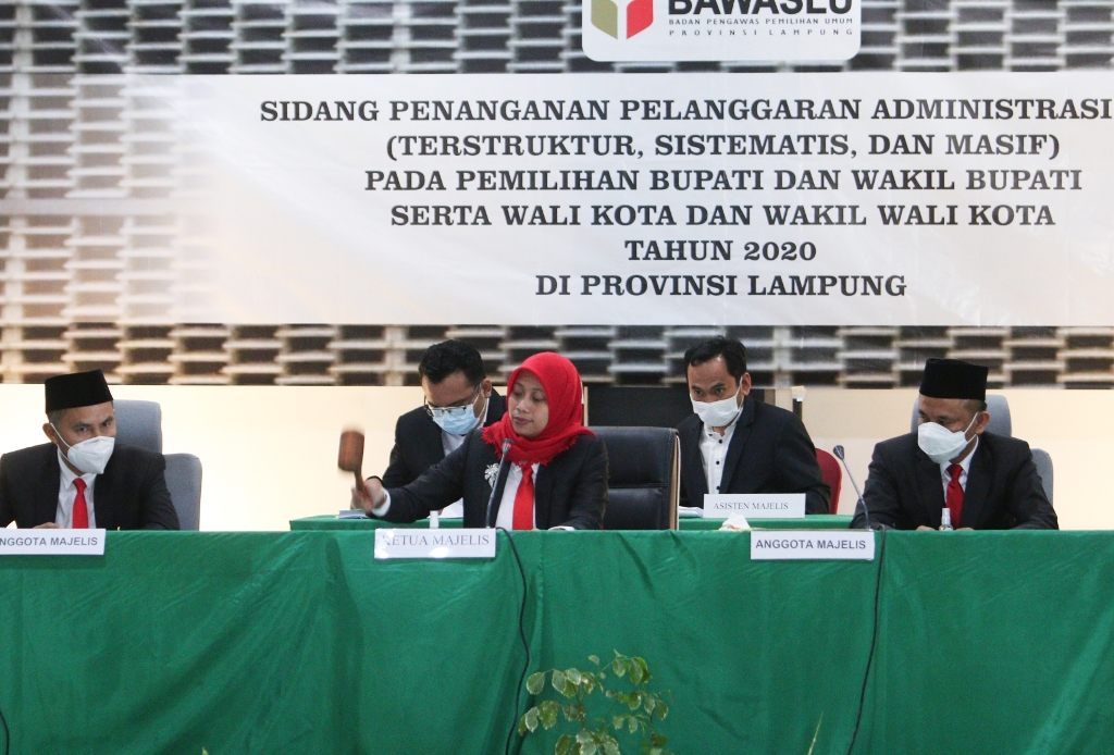 TRIBUNLAMPUNG.CO.ID, Bandar Lampung - Majelis sidang penanganan pelanggaran administrasi TSM Pilkada Bandar Lampung 2020 secara resmi mendiskualifikasi pasangan calon Wali Kota dan Wakil Wali Kota Bandar Lampung nomor 03 Eva Dwiana-Deddy Amarullah.