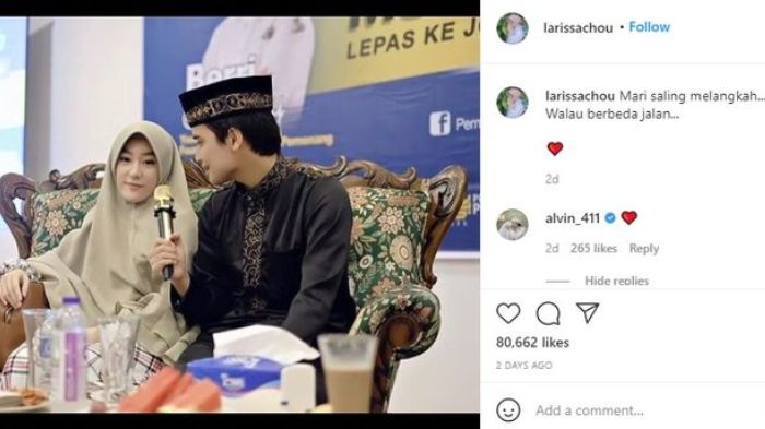 TRIBUNLAMPUNG.CO.ID - Alvin Faiz dan Larissa Chou dikabarkan bercerai. Isu tersebut mencuat setelah postingan Alvin Faiz memposting sebuah foto di Instagram.