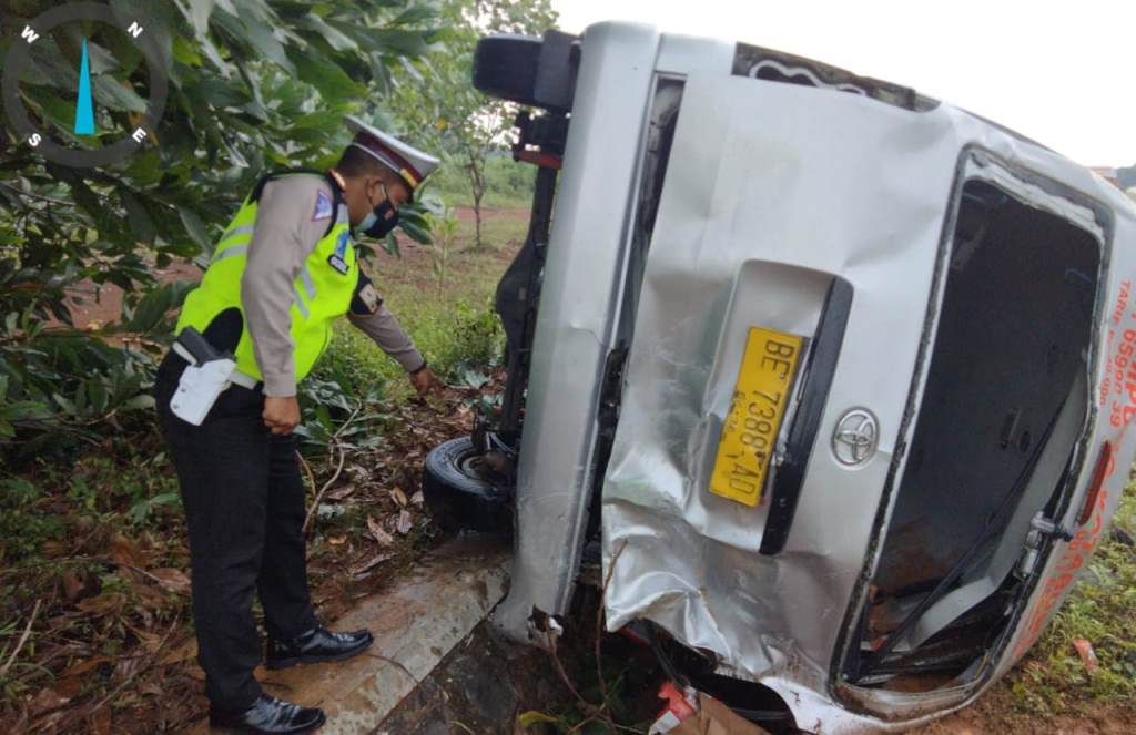 Sebuah mobil travel Toyota Hi Ace nomor polisi BE 7388 AD mengalami kecelakaan tunggal akibat pecah ban.