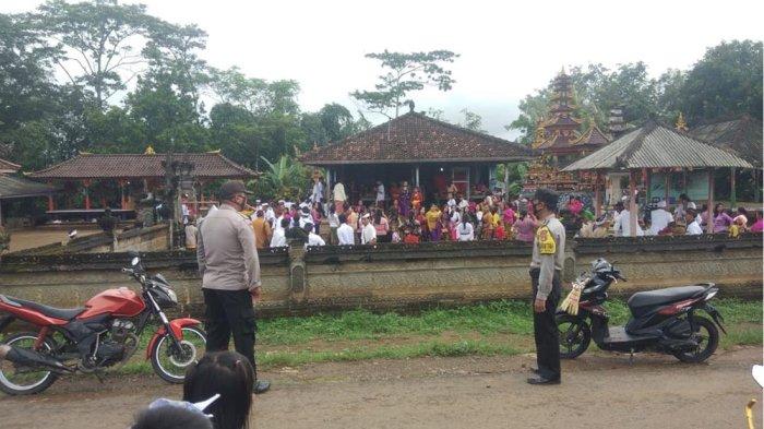 TRIBUNLAMPUNG.CO.ID, WAY KANAN - Polsek Banjit Polres Way Kanan melakukan pengamanan perayaan Galungan dan Kuningan oleh umat Hindu di Pura Pasek Gel-Gel Kampung Bali Utara Kecamatan Banjit Kabupaten Way Kanan, Rabu (10/11/2021).