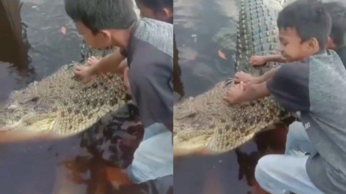 Video yang menampilkan aksi dua bocah asik bermain dengan buaya besar viral di media sosial.