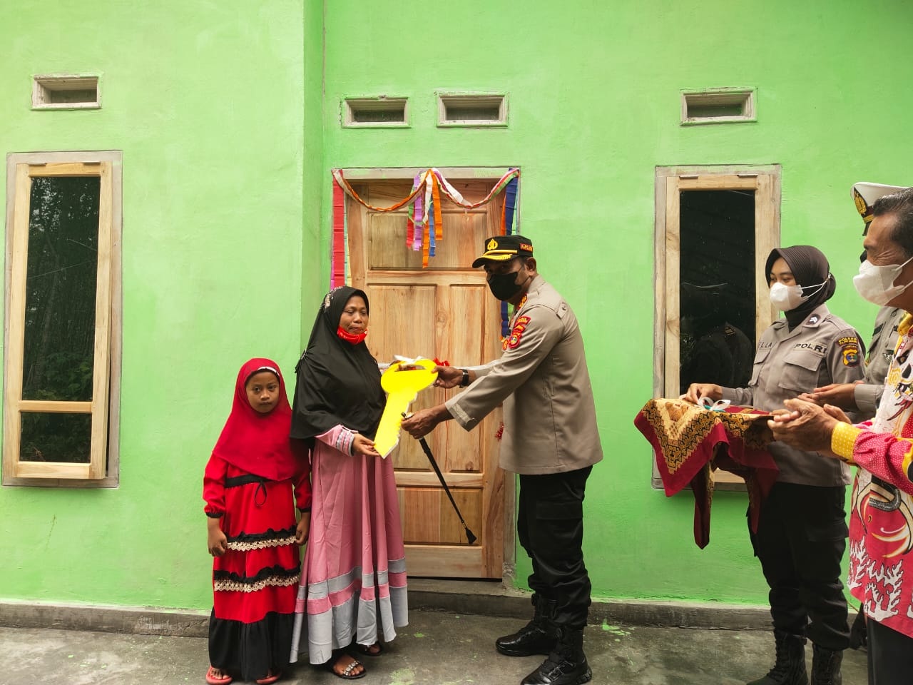 Tribunlampung.co.id, Tulangbawang - Bertepatan dengan ibadah puasa hari ke-6 pada bulan Suci Ramadan 1443 H, Satuan Lalu Lintas (Sat Lantas) Polres Tulangbawang melakukan peresmian dan penyerahan kunci bakti sosial (baksos) bedah rumah Ibu Nginem (35), Jumat (08/04/2022).