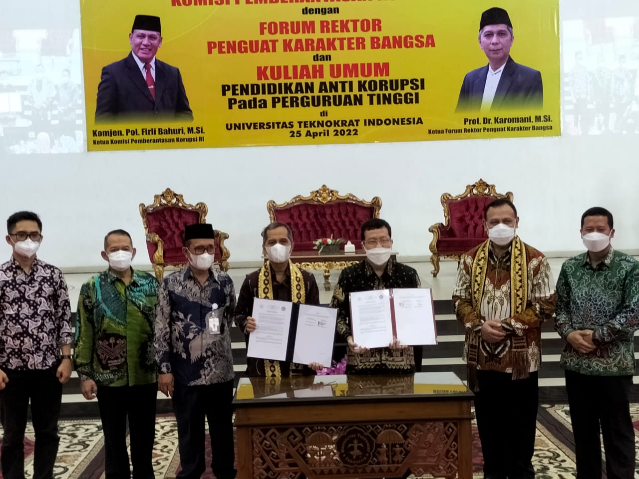 Tribunlampung.co.id, Bandar Lampung - Komisi Pemberantasan Korupsi (KPK) RI melakukan penandatanganan nota kesepahaman dengan Forum Rektor Penguat Karakter Bangsa di Universitas Teknokrat Indonesia, Senin (25/4/2022).