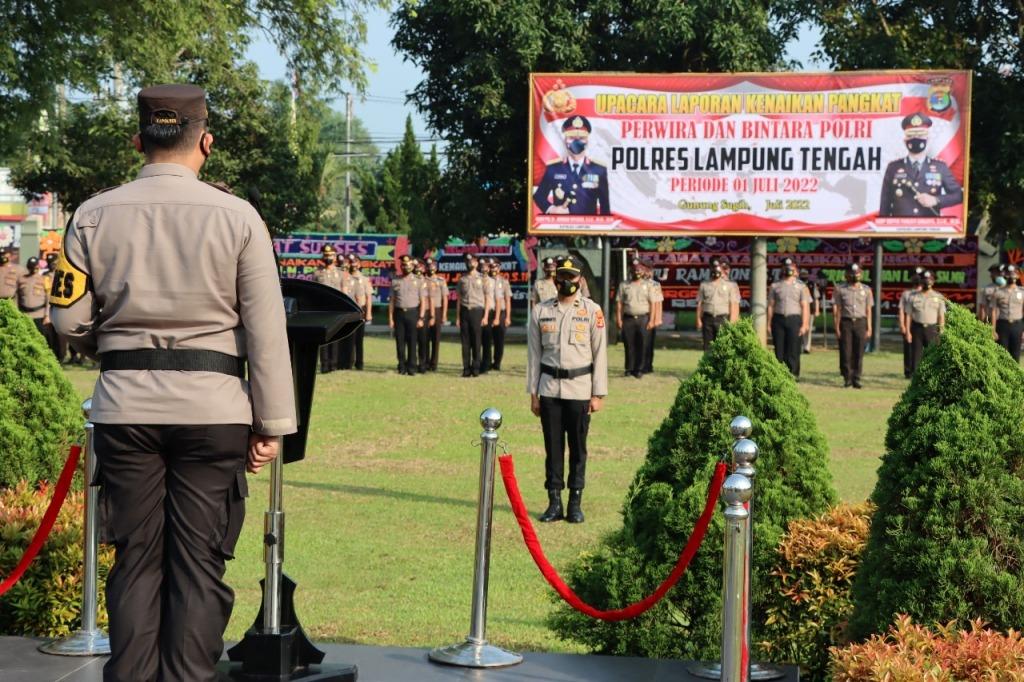 36 personil Polres Lampung Tengah naik pangkat. Kapolres AKBP Doffie Fahlevi Sanjaya pimpin upacara kenaikan pangkat.