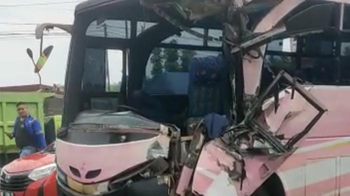 Bus rombongan pelajar SMK Miftahul Ulum ini alami ringsek pada bagian depannya setelah kecelakaan di Bandar Lampung.