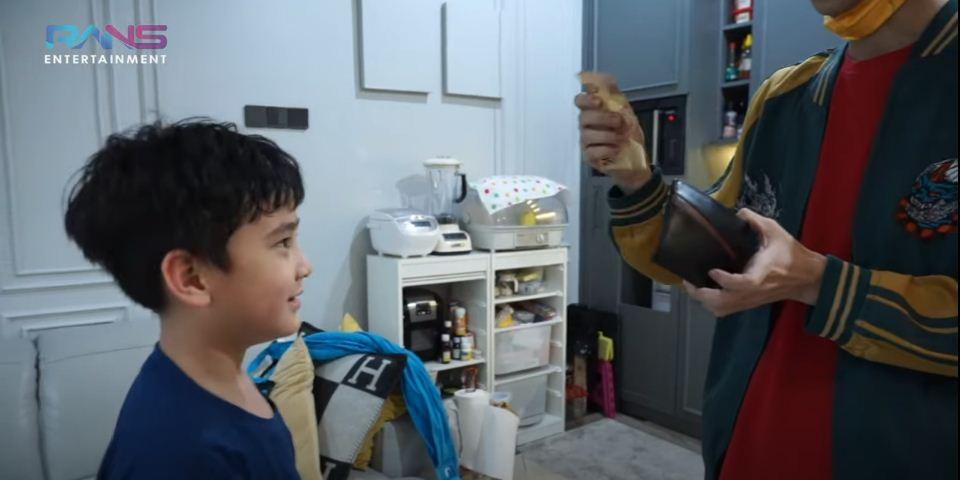 Ia nampak mengeluarkan uang pecahan Rp 2 ribu dari dompetnya untuk ditunjukkan kepada Rafathar.