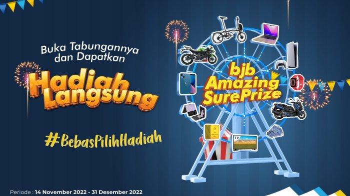 bjb Amazing SurePrize 2022 adalah program promosi berupa pemberian hadiah langsung kepada nasabah yang bersedia menempatkan dana fresh fund pada Giro/Tabungan mulai dari Rp.50.000.000,- (lima puluh juta rupiah). Batas penempatan dana selama tiga bulan.