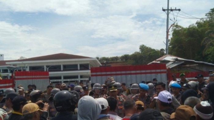 Aparat kepolisian dengan sigap langsung membentuk barisan blokade untuk mencegah masa masuk ke lingkungan kantor pemkab.