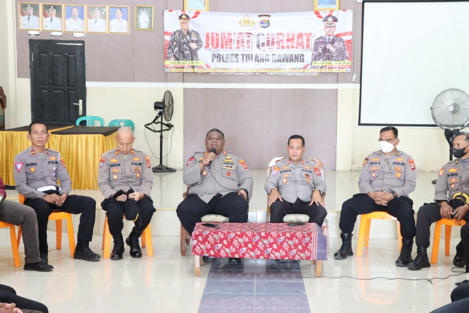 "Saya berharap warga tidak perlu sungkan ataupun takut menyampaikan curhatannya terkait pelayanan yang telah diberikan oleh Polres Tulang Bawang dan Polsek Banjar Agung, karena akan menjadi bahan evaluasi untuk meningkatkan pelayanan yang lebih prima lagi kepada warga," ucap AKBP Jibrael membuka kegiatan Jum'at Curhat.