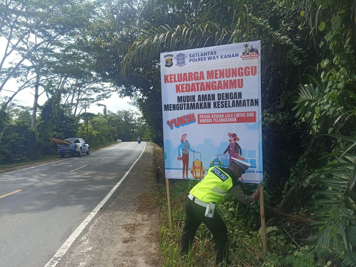 Unit Kamsel Satlantas Polres Way Kanan melaksanakan pemasangan benner himbauan kepada pengguna jalan atau pemudik yang melintas di Jalinsum Way Kanan.