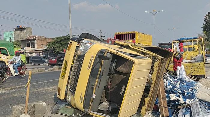 Truk bermuatan kaca terguling setelah kecelakaan dihantam truk rem blong, Jumat (13/10/2023).
