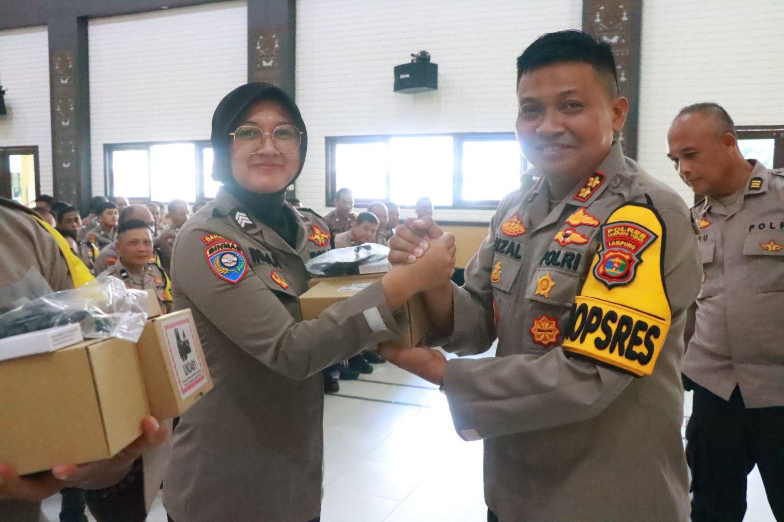 TRIBUNLAMPUNG.CO.ID, Lampung Timur - Kapolres Lampung Timur, Polda Lampung, AKBP M Rizal Muchtar secara simbolis menyerahkan barang inventaris dinas berupa HP Motorola Lex 11A kepada bhabinkamtibmas.