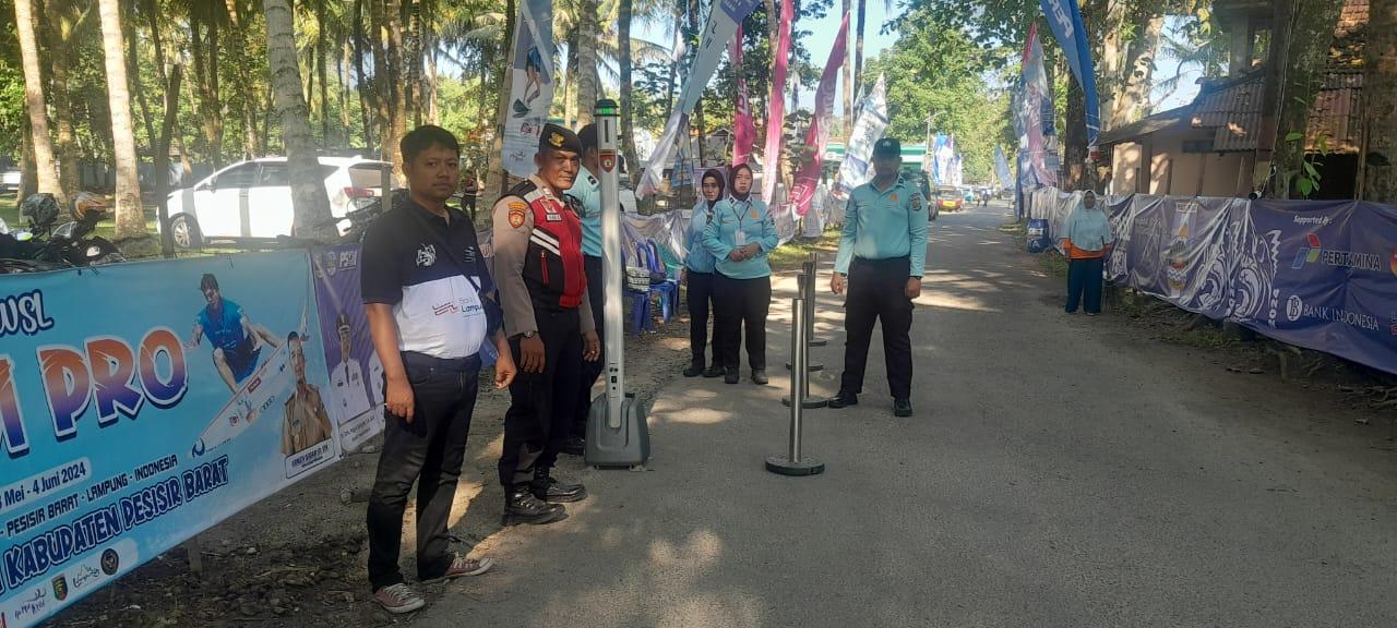 TRIBUNLAMPUNG.CO.ID, Pesisir Barat – Polres Pesisir Barat, Polda Lampung terus mengintensifkan pengamanan pada hari ke-4 berlangsungnya Kejuaraan Surfing Internasional Krui Pro WSL QS 5000 di Pantai Wisata Tanjung Setia, pekon Tanjung Setia, Kec. Pesisir Selatan, Kab. Pesisir Barat, Jumat (31/05/24).