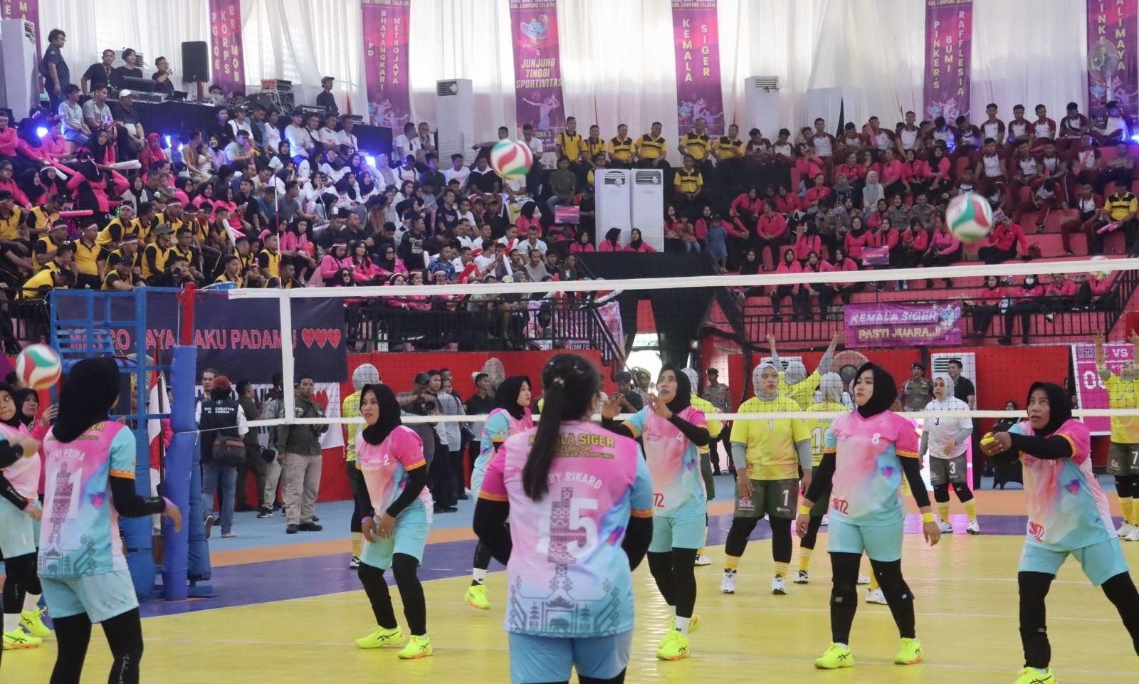 TRIBUNLAMPUNG.CO.ID, Lampung Selatan - Pembukaan Turnamen Bola Voli Bhayangkari Cup 2024 Zona 3 Lampung resmi digelar di GOR Way Handak wilayah hukum (wilkum) Polres Lampung Selatan, Polda Lampung, Selasa (13/8/2024).